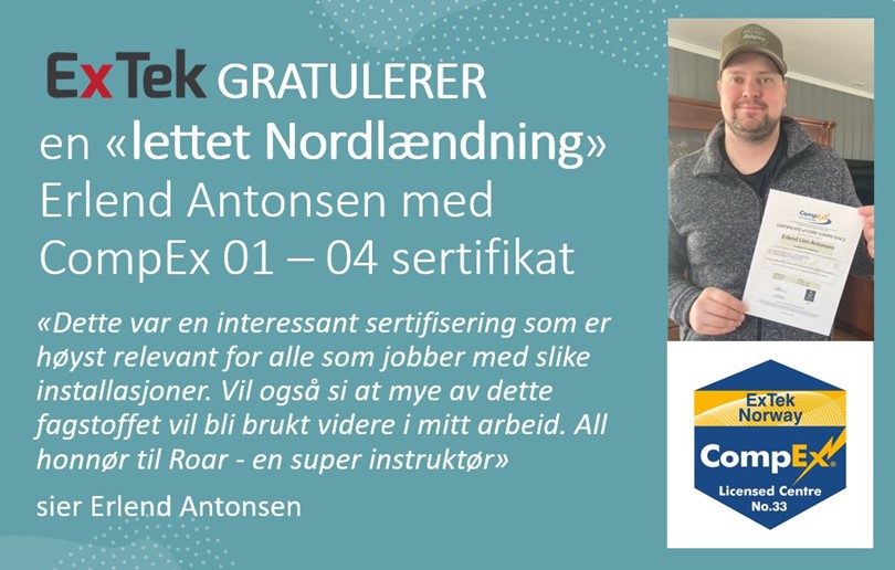 ExTek GRATULERER EN LETTET OG GLAD NORDLÆNDNING, ERLEND ANTONSEN MED COMPEX 01 - 04 SERTIFIKAT. Bestått på første forsøk. Bra jobba !!!