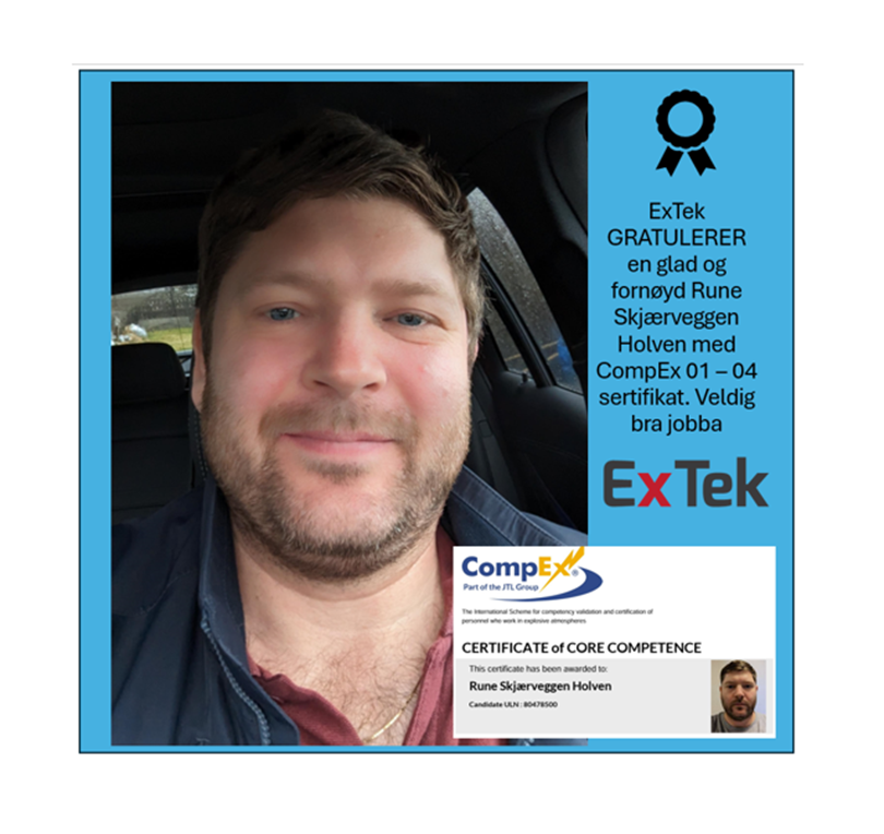 Nå har enda en kandidat bestått CompEx 01 - 04 og vi er stolte av å kunne GRATULERE Rune Holven som jobber i Odfjell Drilling med sertifikat. Om vi ikke treffes før oppdatering innen 5 år, så ønsker vi deg lykke til med arbeid i Ex områder.