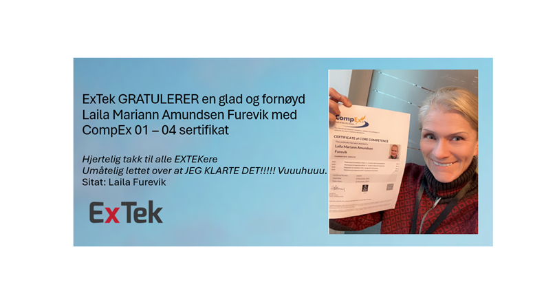 ExTek GRATULERER en glad og fornøyd Laila Mariann Amundsen Furevik med CompEx 01 – 04 sertifikat