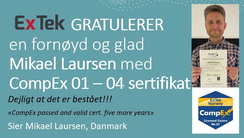 "Dejligt at det er bestået!!!" ExTek GRATULERER Mikael Laursen med CompEx 01 - 04 sertifikat